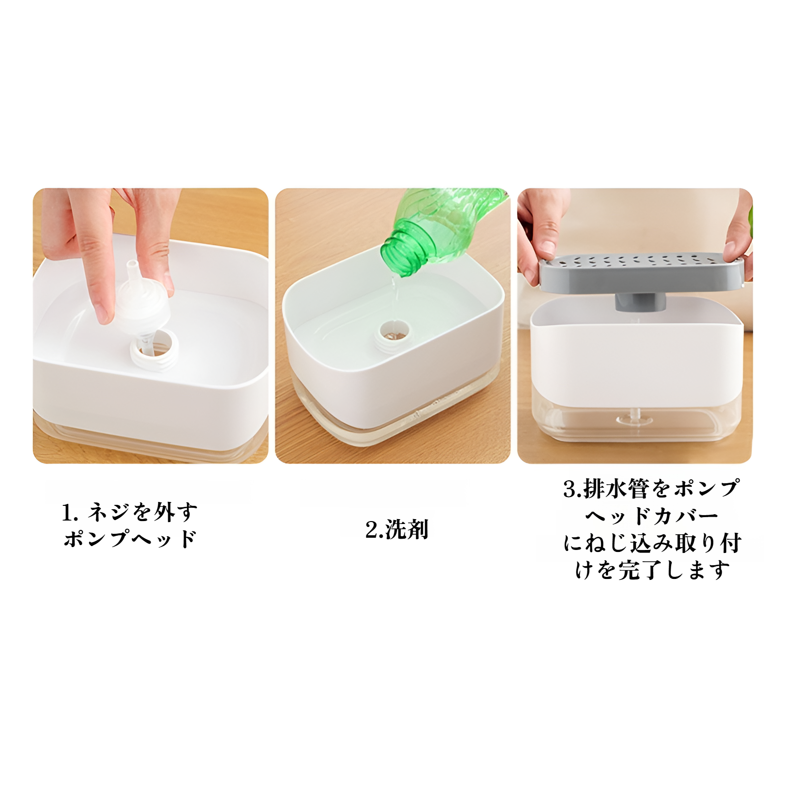 スポンジ置き スポンジホルダー 食器洗剤ディスペンサー ワンプッシュで洗剤がでる 片手操作 水切り機能 省スペース 洗剤ボトル ディスペンサー スポンジ置き キッチン 洗剤ディスペンサー 洗剤ボトル
